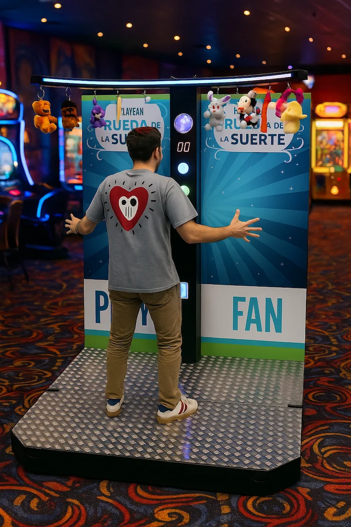 La rueda de la suerte tiene un juego muy sencillo, rápido y limpio. Atrapar el mayor número de palos que caen, depende únicamente de la destreza del jugador. El proceso completo de juego sería: